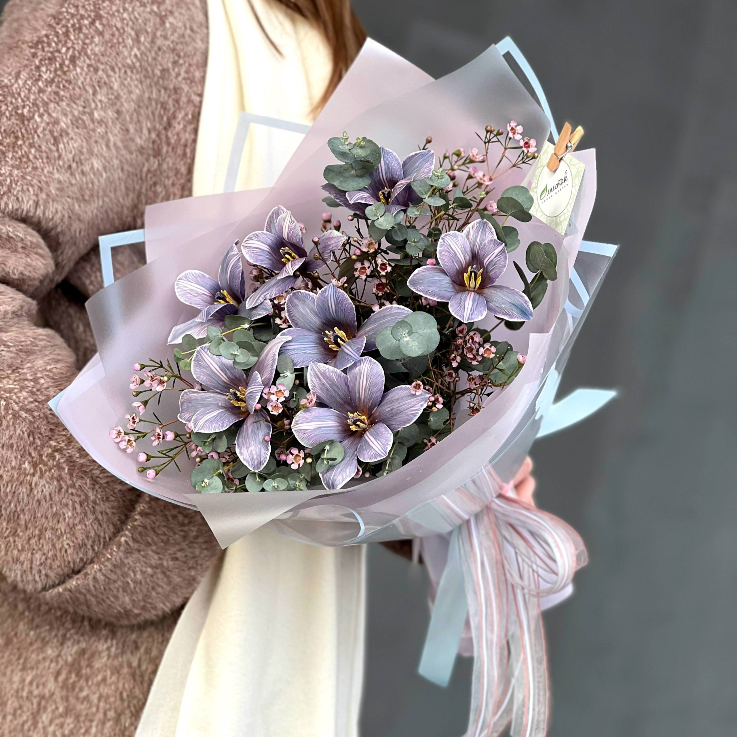 Букет из зимних тюльпанов и хамелациума в Зеленоградске