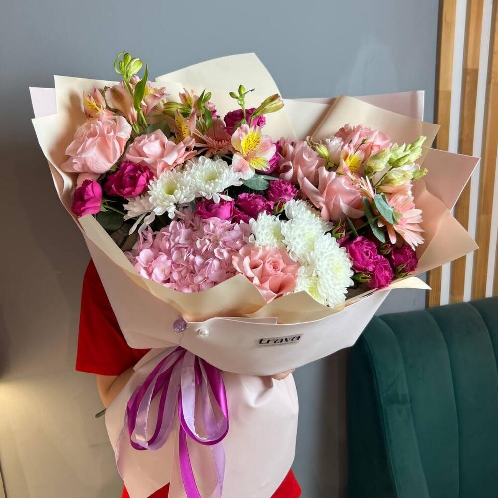 Роскошный букет из гортензии, французских роз с эустомой, герберой и хризантемой. Этот шикарный букет идеально подойдёт в качестве извинений для жены или девушки. Ни одна женщина перед таким не устоит.