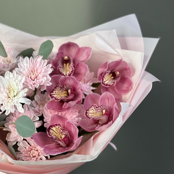 Букет из нежной экзотической орхидеи и кустовых хризантем, разбавленных припыленным оттенком эвкалипта- стильный, очаровательный и очень стойкий! Будет долго радовать получателя своей красотой и нежностью!